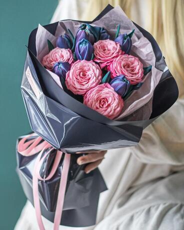 БУКЕТ «ФРЕЗИЯ, РАНУНКУЛЮС, ОЗАТАМНУС, КУСТОВАЯ РОЗА»