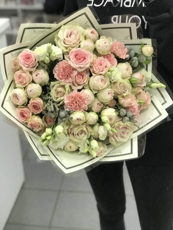 Состав: Бруния, Гвоздика, Роза пионовидная, Розы и Эустома