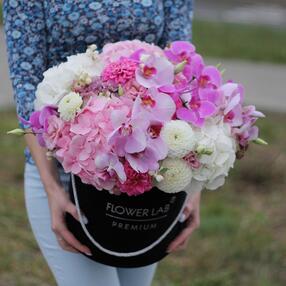 Состав: гортензия, орхидеи, георгины, эустома, зелень, коробка FlowerLab Premium