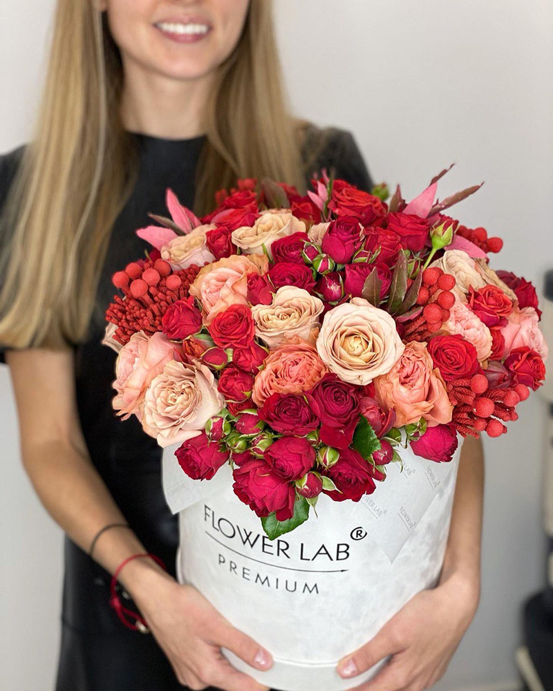 Состав: Роза Кахала, Берцелия красная, Тюльпан Дабл Принцесс, Роза каппучино и Кустовая роза