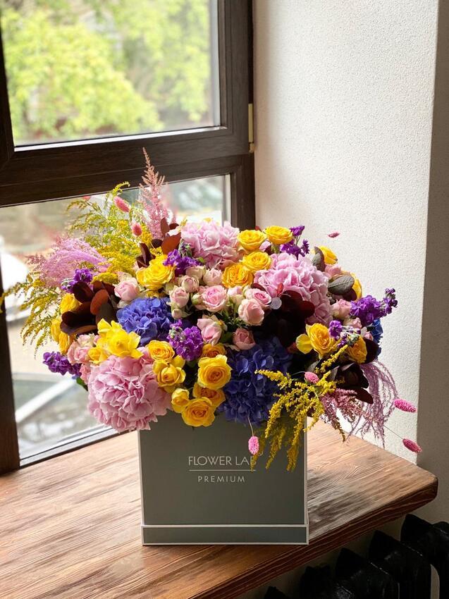 Состав: роза кустовая, гортензия, сухоцвет, большая коробка-куб FlowerLab Premium